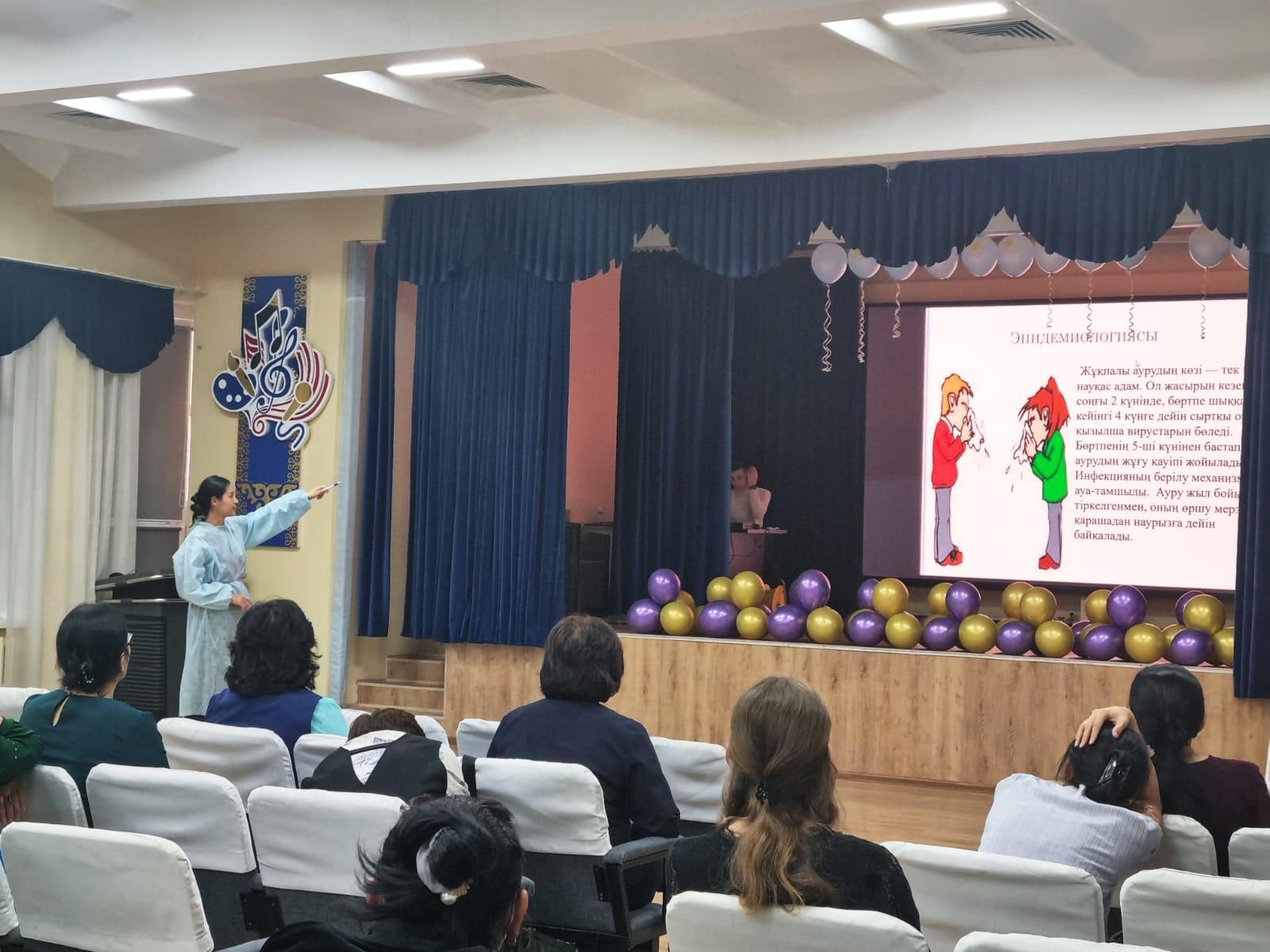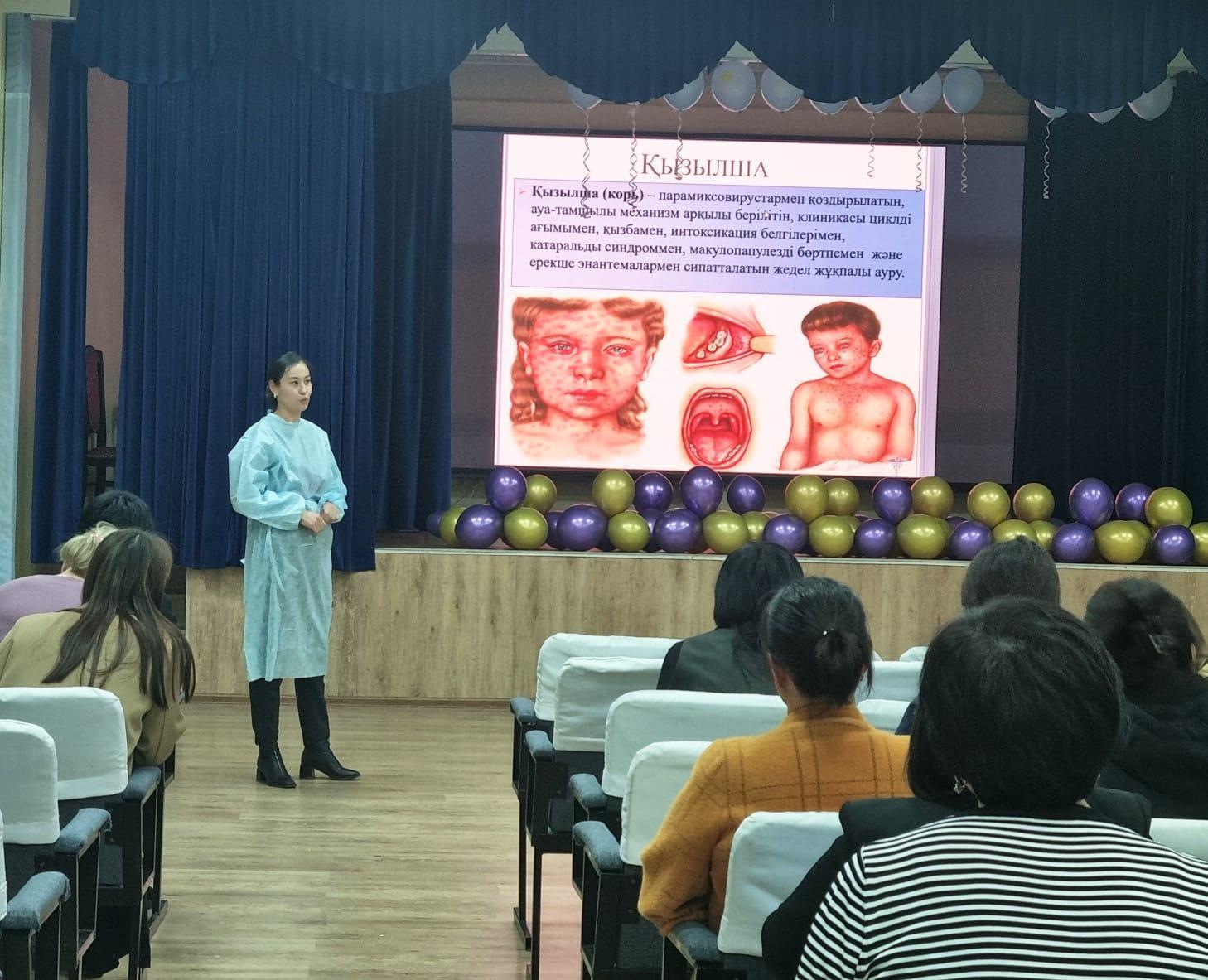 №1 қалалық балалар емханасының білікті балалар дәрігері Н.Н.Ыбыраева және мектебіміздің медбикесі Е.Б.Сыдықбек мұғалімдерге қызылша ауруларының алдын алу тақырыбында түсіндірме жұмысын жүргізді. Инфекцияның алдын алу, белгілері байқалған жағдайда қандай көмек көрсету керек екенін және аурудың толық сипаттамасымен таныстырды.