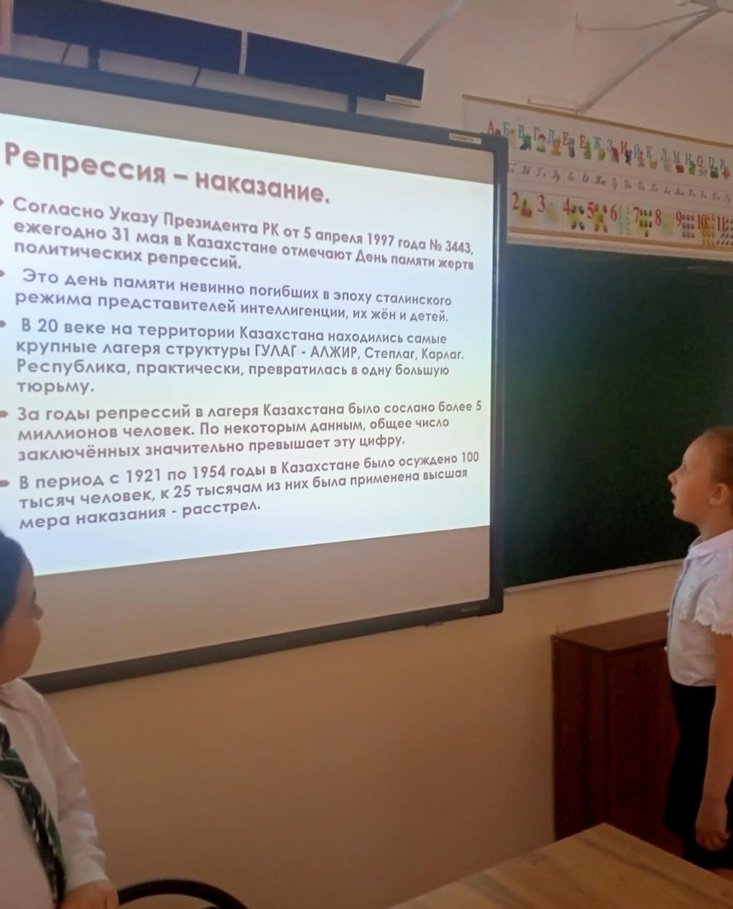 31-мамыр Саяси қуғын-сүргін құрбандарын еске алу күніне орай 1-11 сыныптар арасында №19 жалпы білім беретін мектепте сынып сағаттары өткізілді. Оқушылар репрессияға ұшырап, қаза болғандарды еске алды.