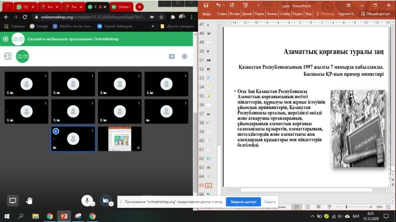 Мақсаты: Оқушыларға «азаматтық қорғаныс» ұғымын төтенше жағдайларда қауіпсіз жүріс-тұрыс дағдыларын қалыптастыру; төтенше жағдай кезінде жеке қорғаныс құралдарын пайдалану, өзара көмек көрсету міндеттерін түсіндіру. Аталған сабақта педагогтар білім алушыларға төтенше жағдайғаларда дайын болуға, кез-келген қиындықта жылдам әрі дұрыс шешім жасауларына бағыт бағдар берді.