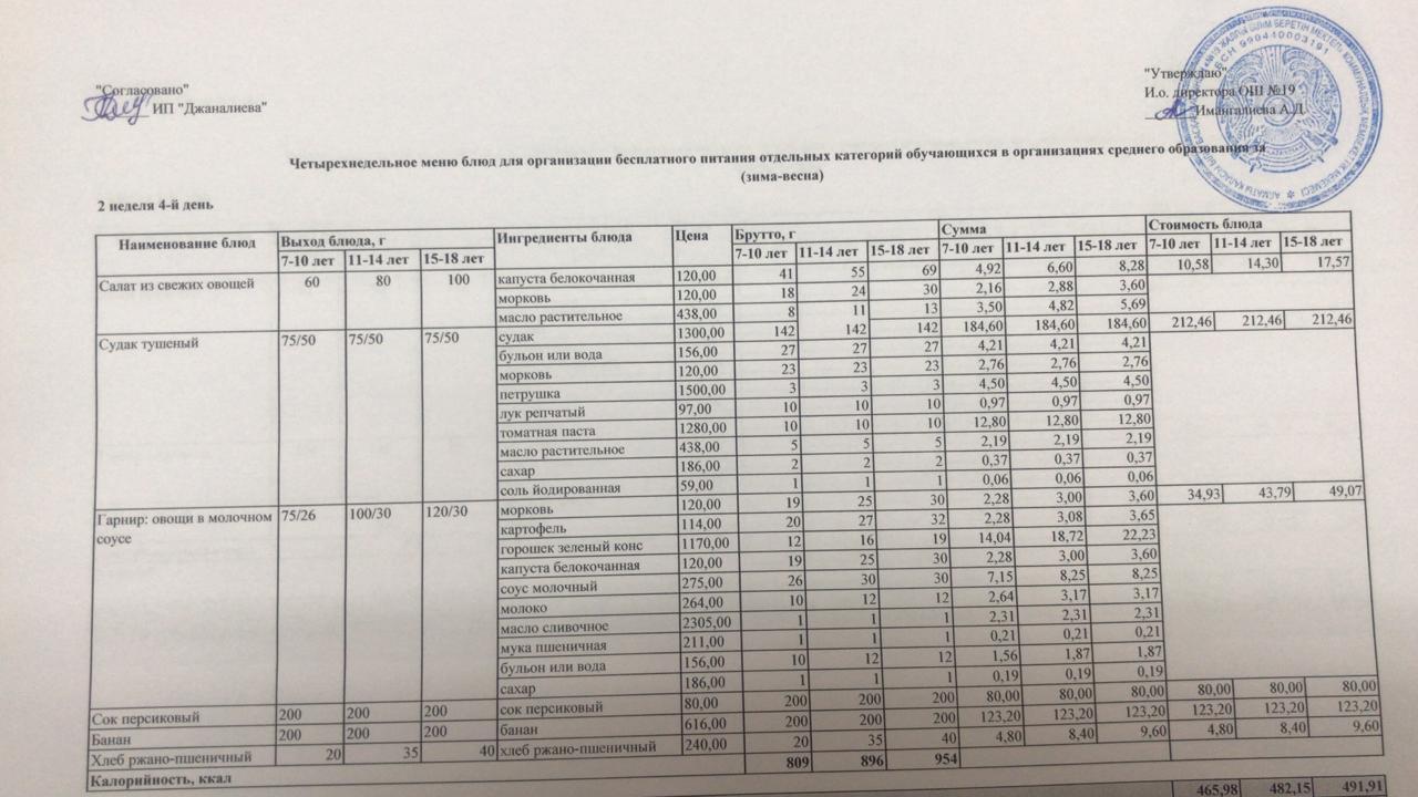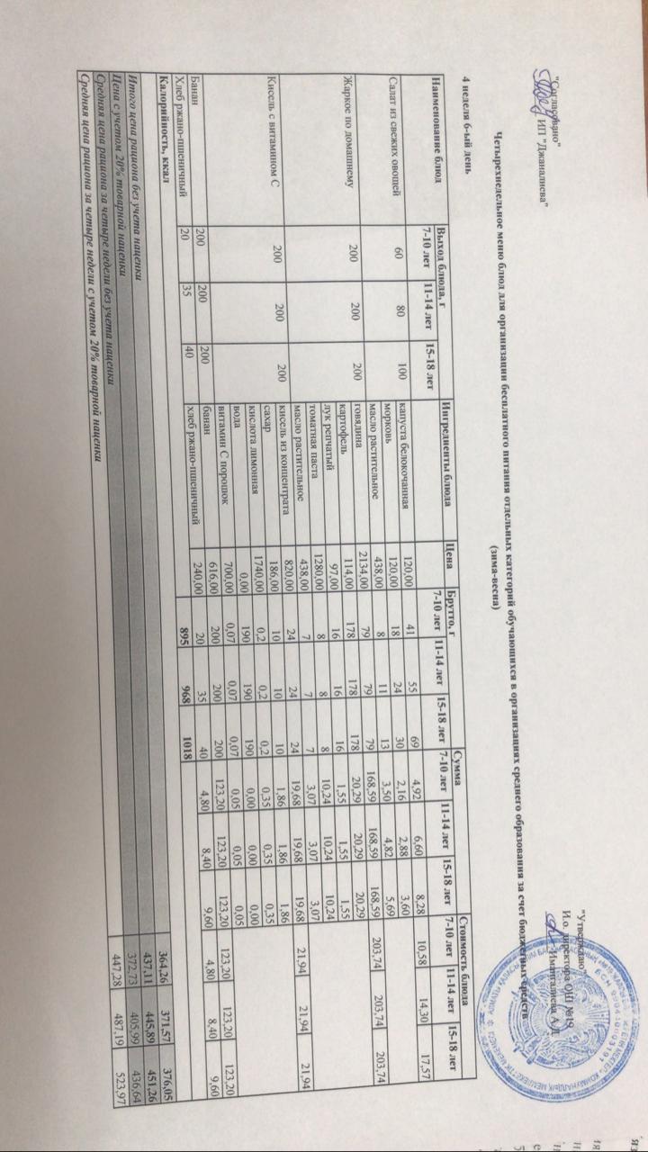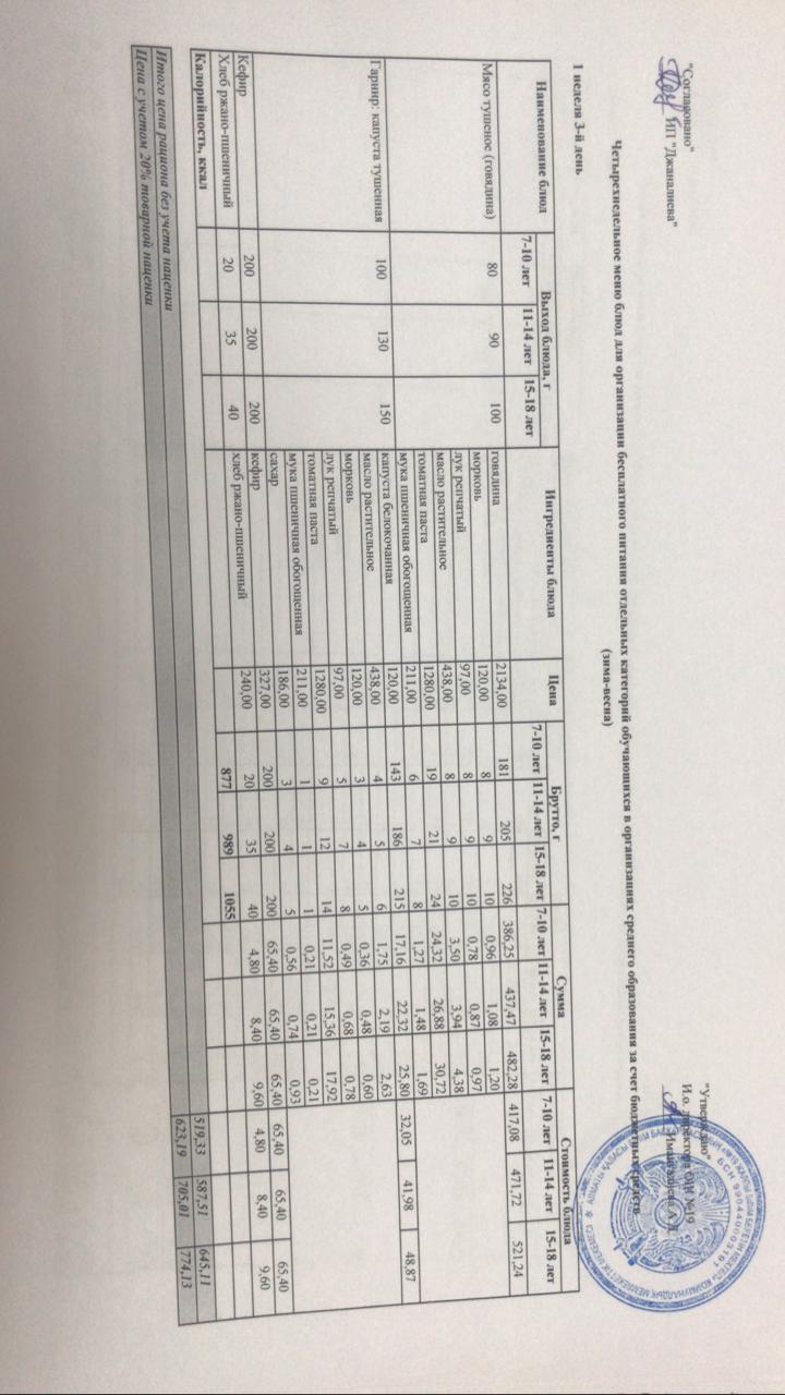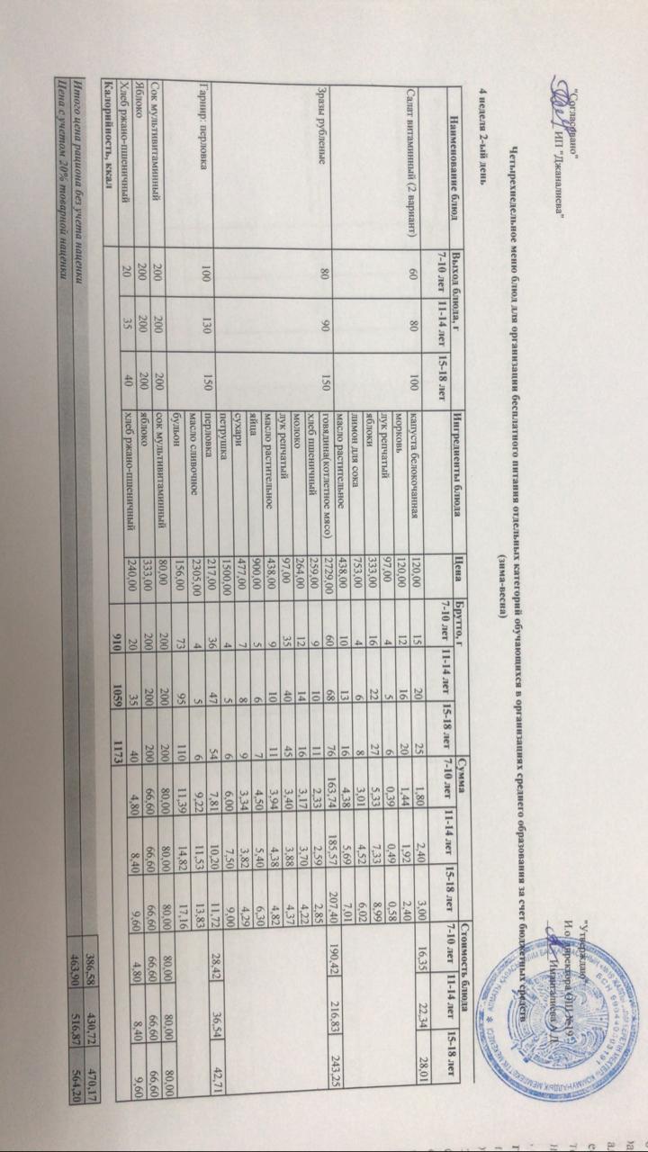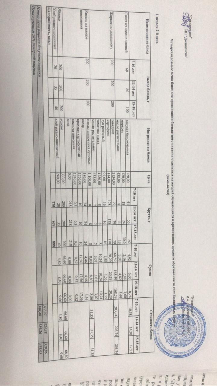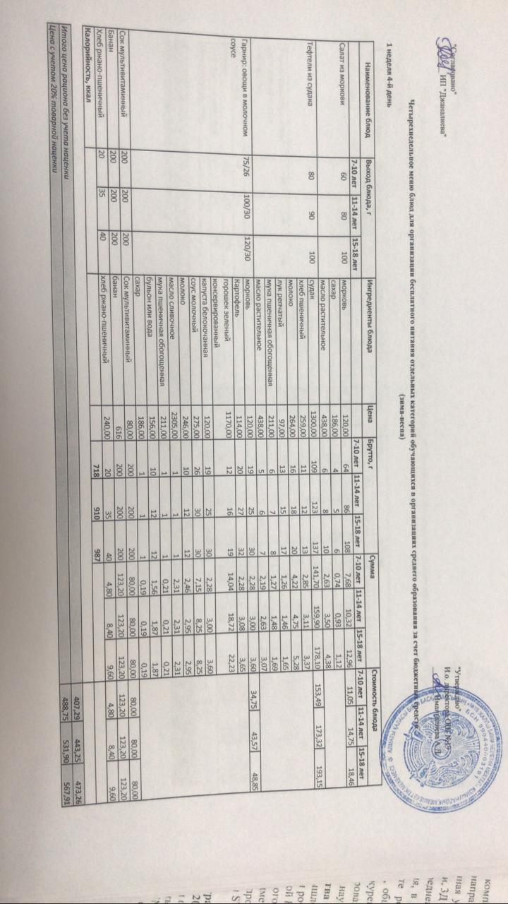 Четырехнедельное меню блюд для организации бесплатного питания отдельных категорий обучающихся в организациях среднего образования за счет бюджетных средств (зима - весна)