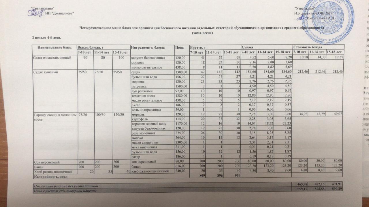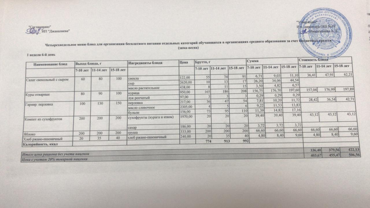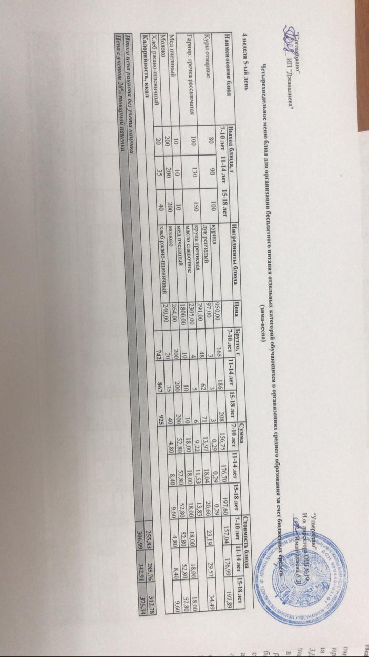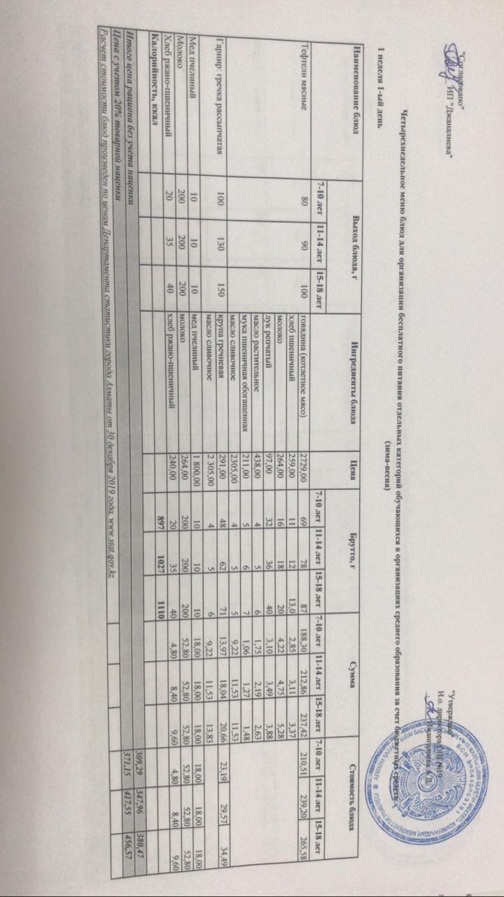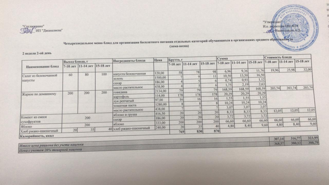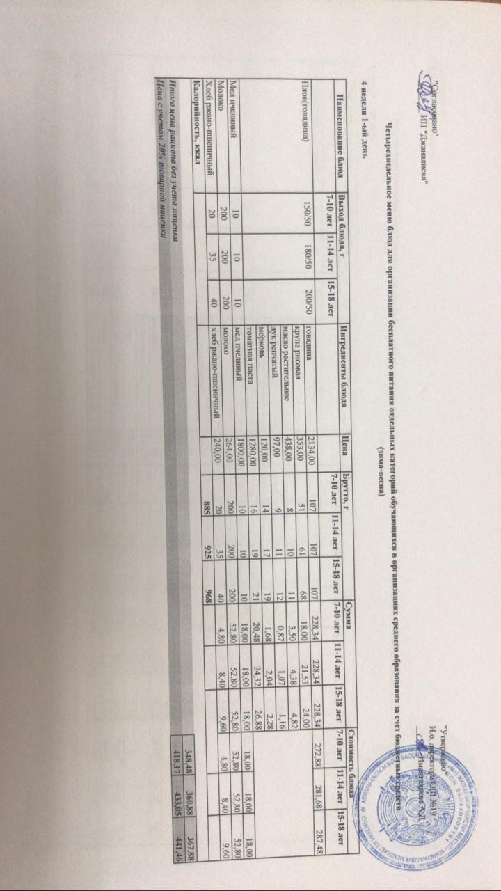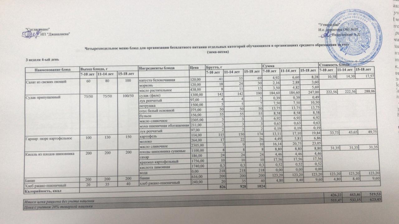 Четырехнедельное меню блюд для организации бесплатного питания отдельных категорий обучающихся в организациях среднего образования за счет бюджетных средств (зима - весна)