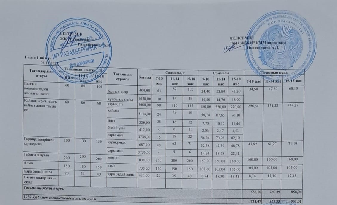 Күнделікті тегін тамақтану мәзірі (06.11.2023)