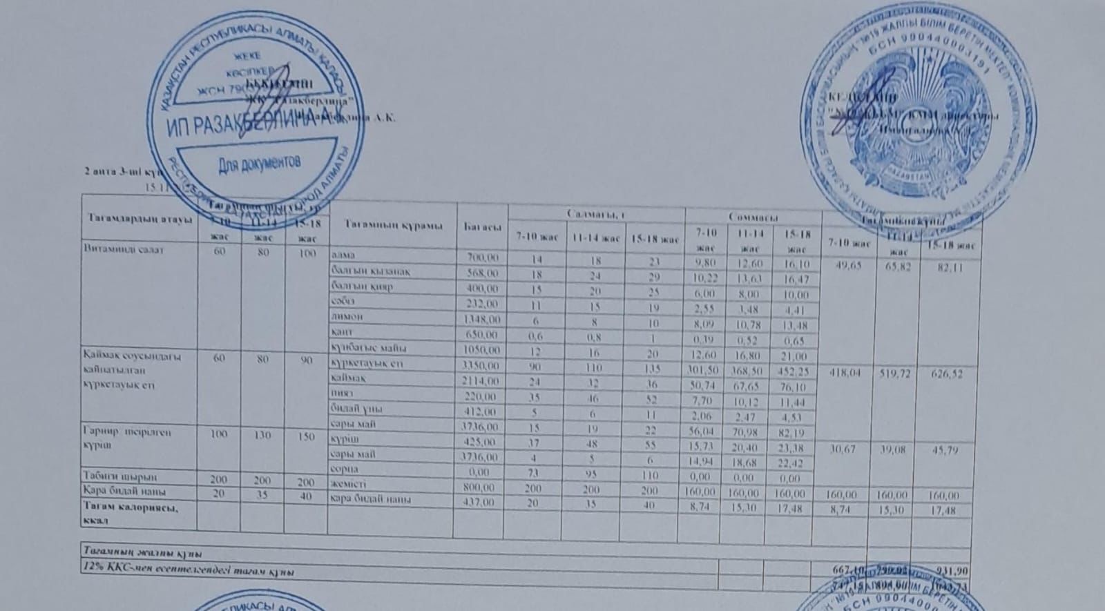 Күнделікті тегін тамақтану мәзірі (15.11.2023)