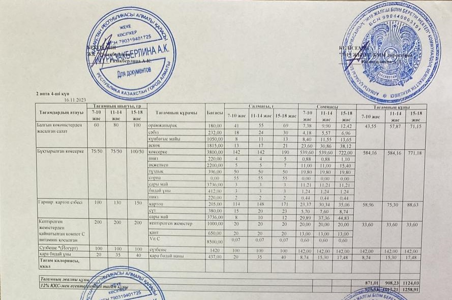 Күнделікті тегін тамақтану мәзірі (16.11.2023)