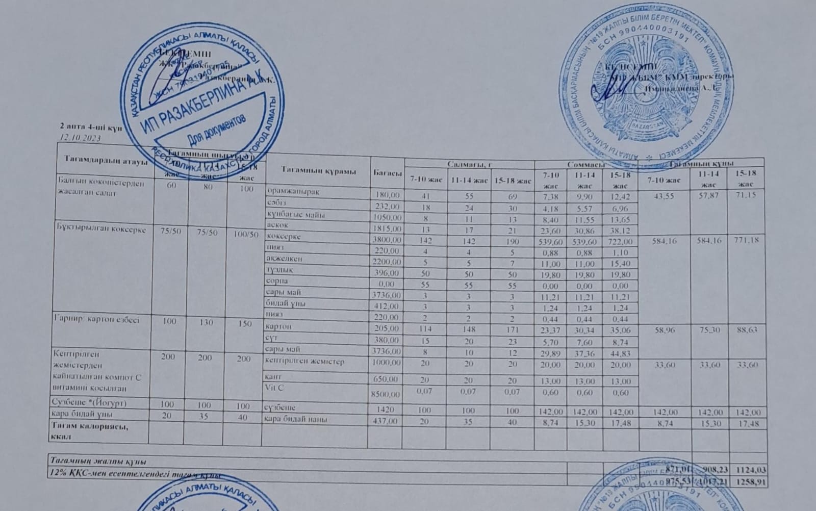 Күнделікті тегін тамақтану мәзірі (12.10.2023)