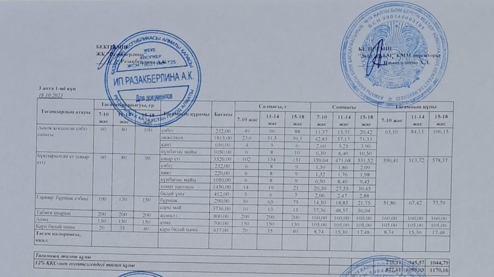 Күнделікті тегін тамақтану мәзірі (16.10.2023)