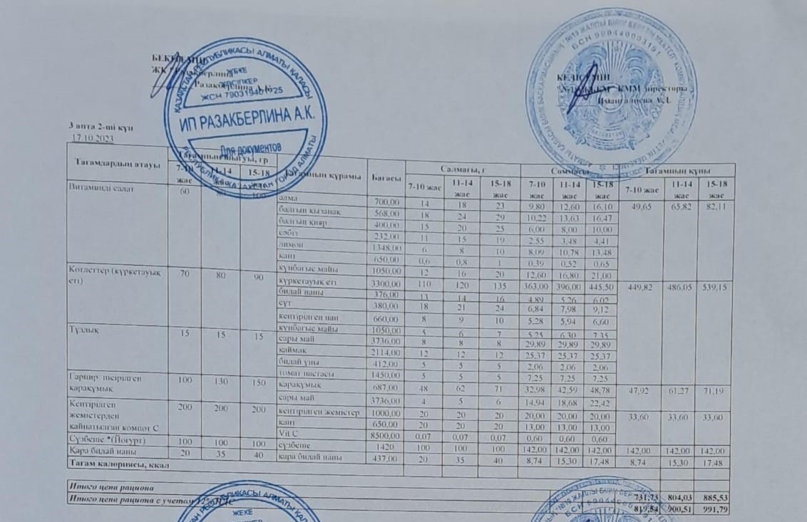 Күнделікті тегін тамақтану мәзірі (17.10.2023)