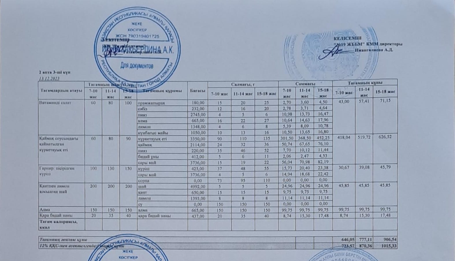 Күнделікті тегін тамақтану мәзірі (13.12.2023)