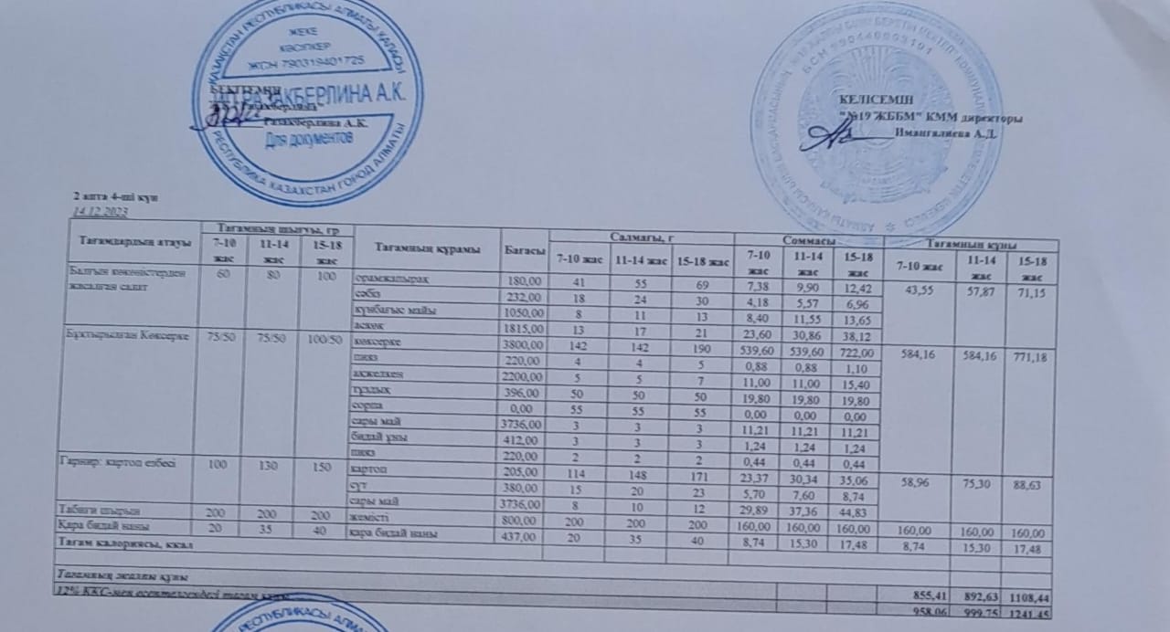Күнделікті тегін тамақтану мәзірі (14.12.2023)