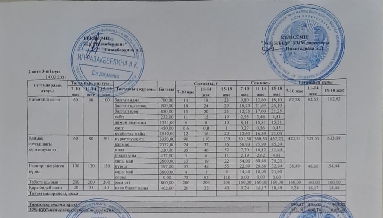 Күнделікті тегін тамақтану мәзірі (14.02.2024)