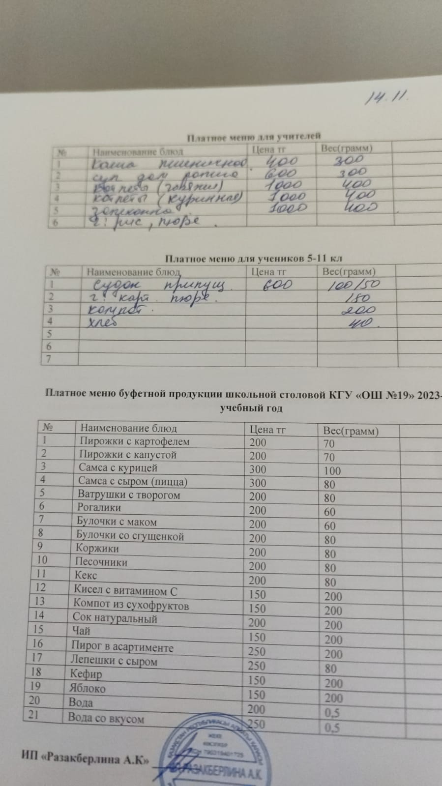 » Күнделікті ақылы тамақтану мәзірі (14.11.2024)