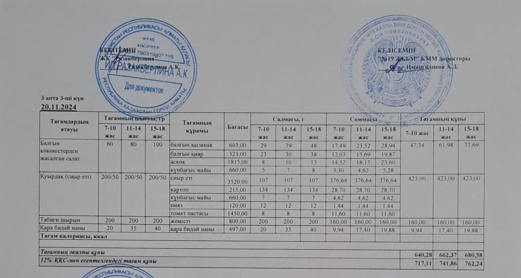 Күнделікті тегін тамақтану мәзірі (20.11.2024)