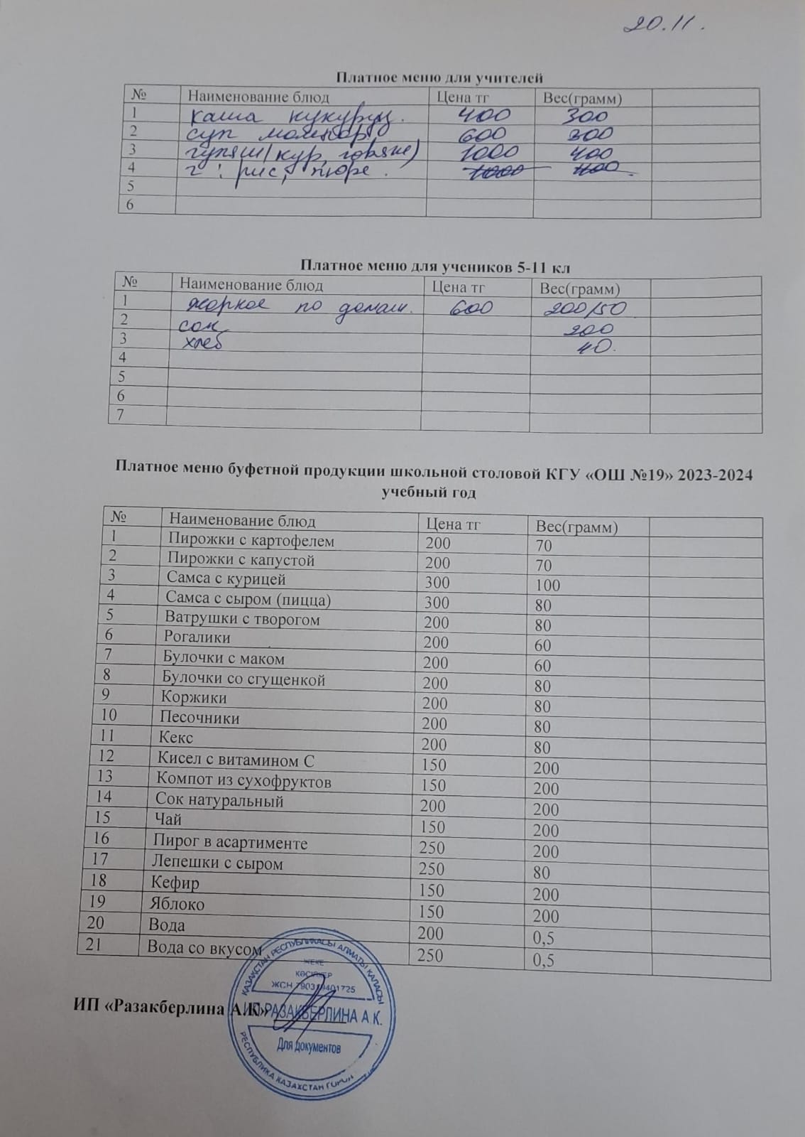 » Күнделікті ақылы тамақтану мәзірі (20.11.2024)