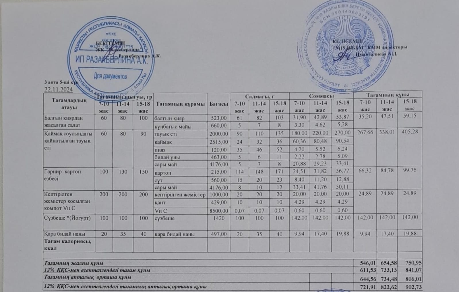 Күнделікті тегін тамақтану мәзірі (22.11.2024)
