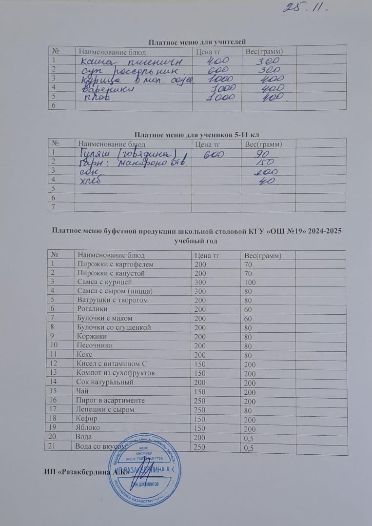 » Күнделікті ақылы тамақтану мәзірі (25.11.2024)