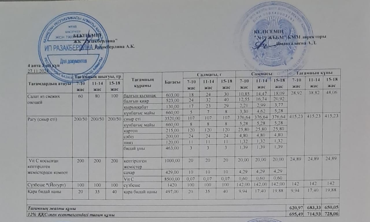 Күнделікті тегін тамақтану мәзірі (27.11.2024)