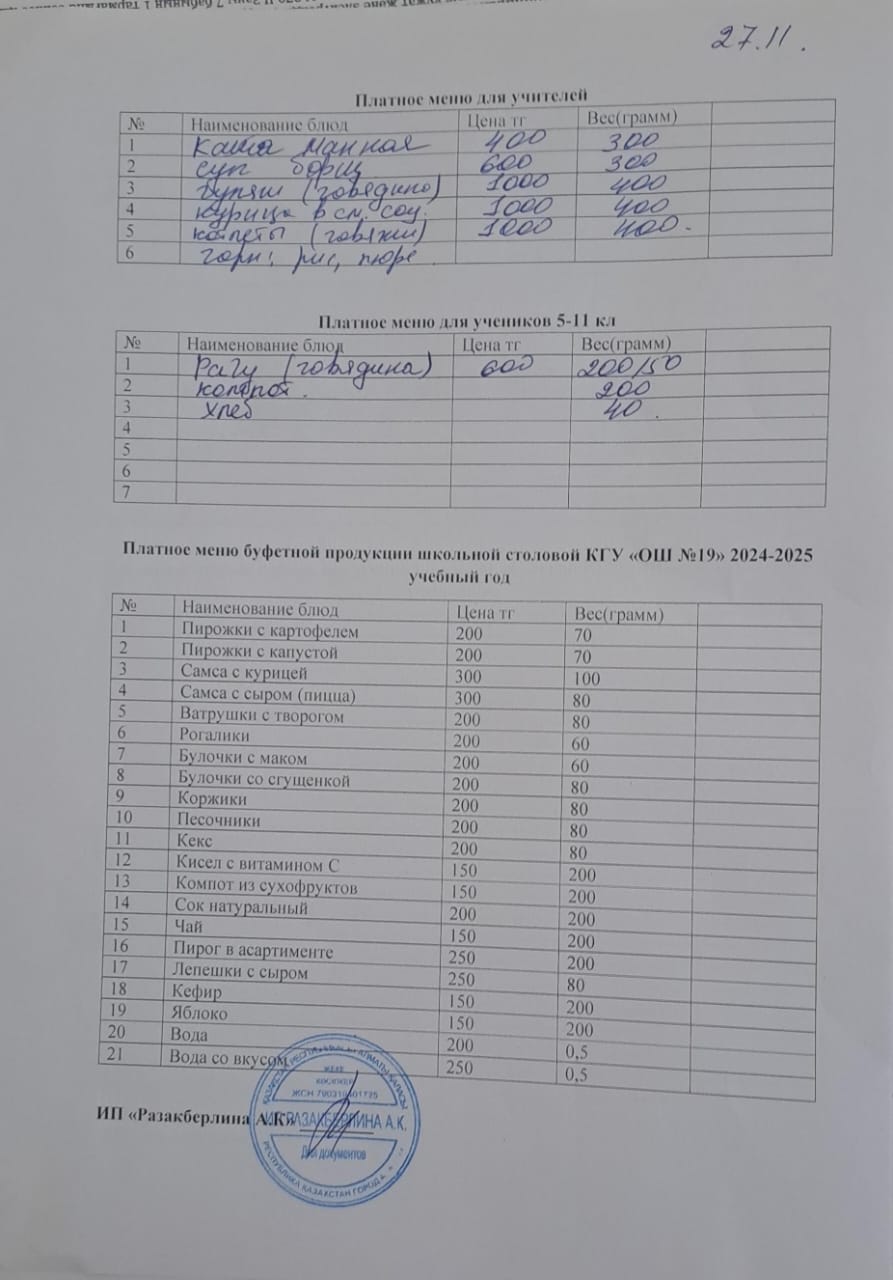 Күнделікті ақылы тамақтану мәзірі (27.11.2024)