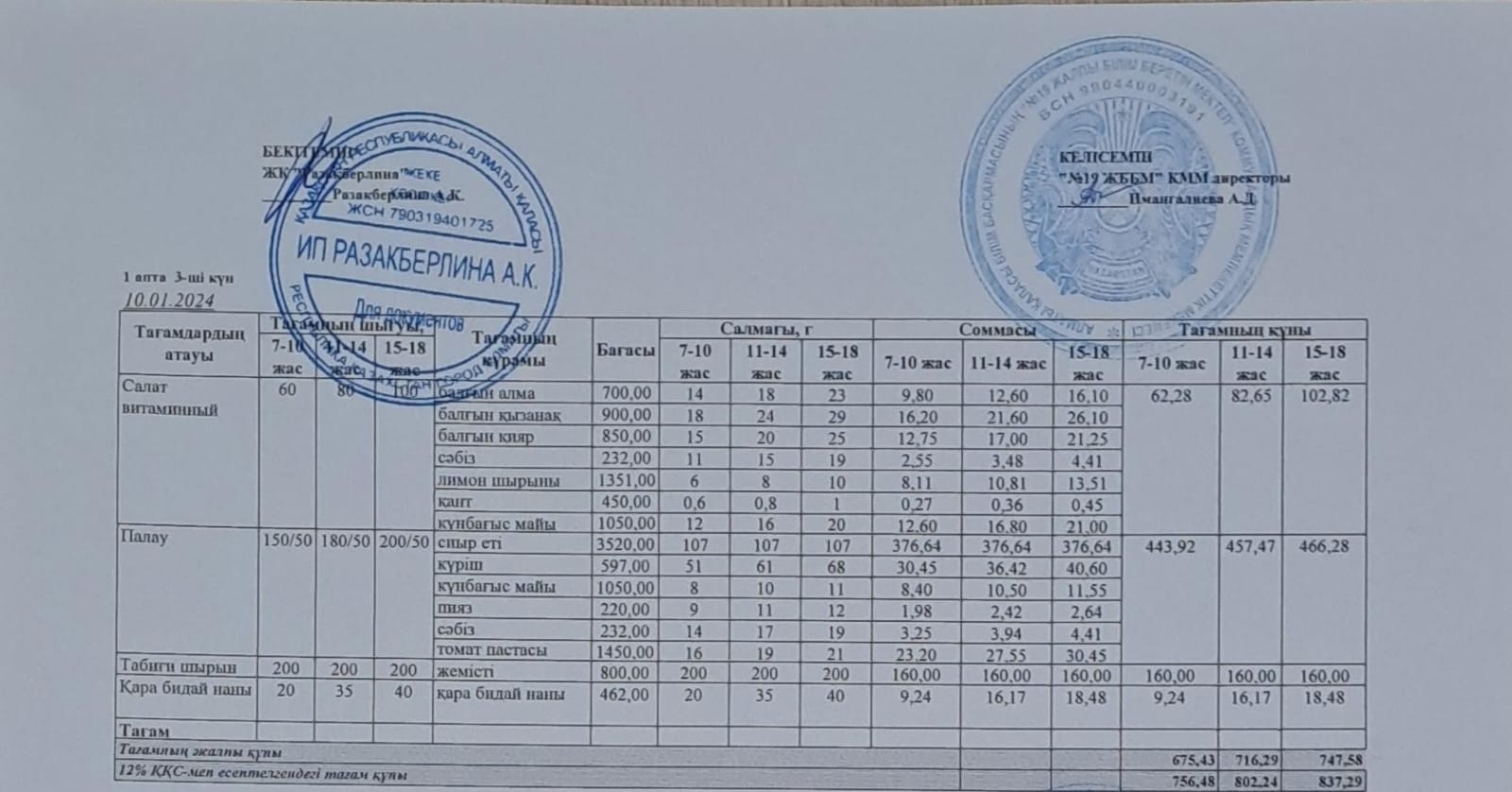 Күнделікті тегін тамақтану мәзірі (10.01.2024)