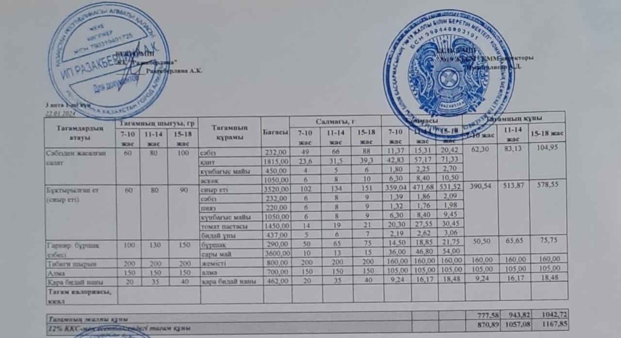 Күнделікті тегін тамақтану мәзірі (22.01.2024)