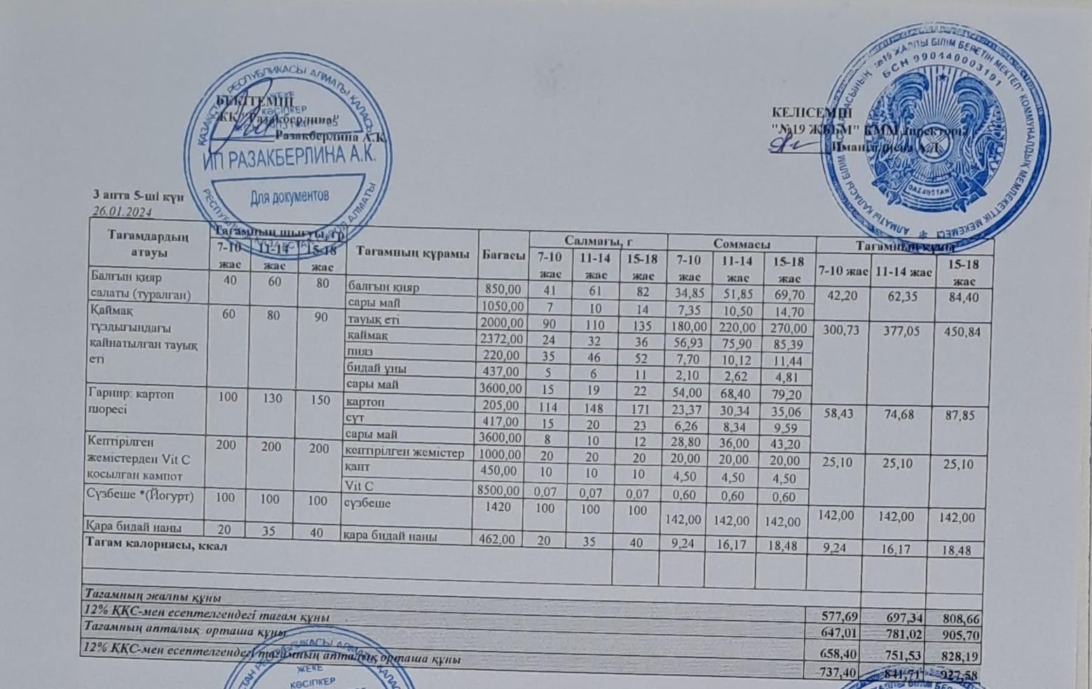 Күнделікті тегін тамақтану мәзірі (26.01.2024)