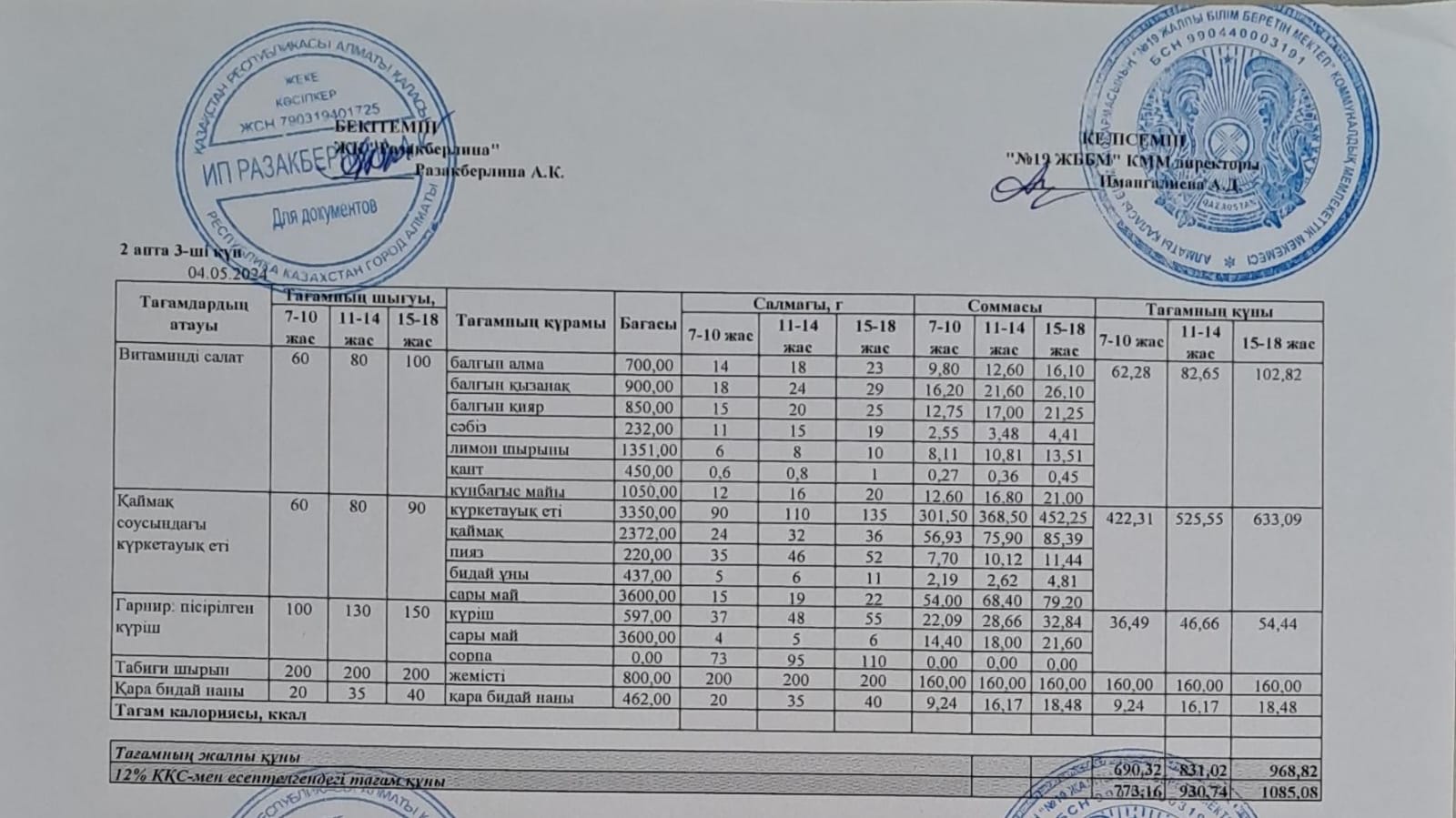Күнделікті тегін тамақтану мәзірі (04.05.2024)