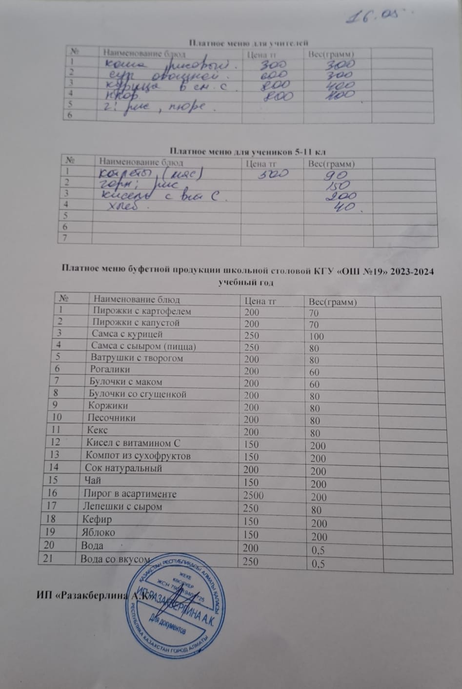» Күнделікті ақылы тамақтану мәзірі (16.05.2024)