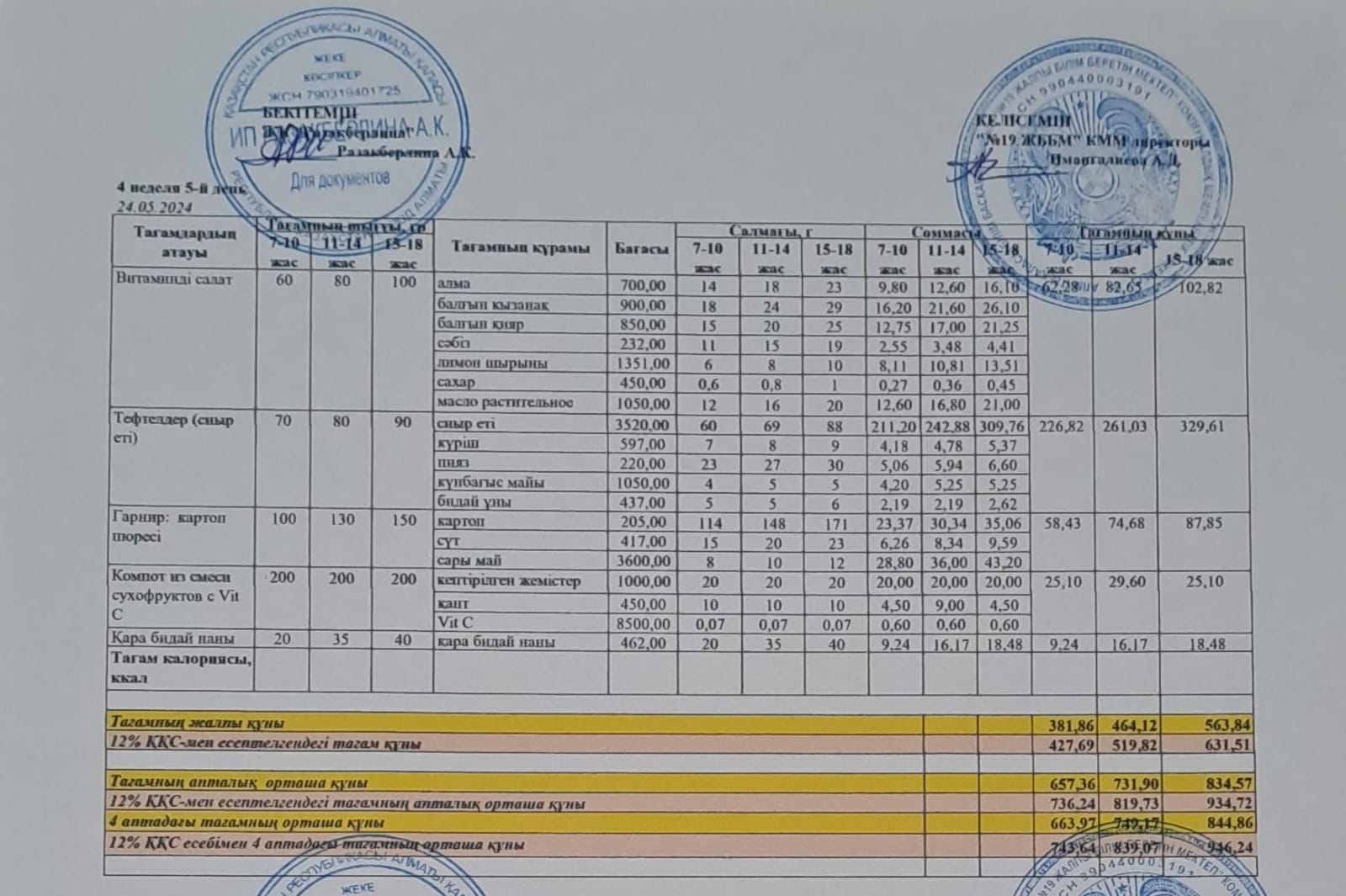 Күнделікті тегін тамақтану мәзірі (24.05.2024)