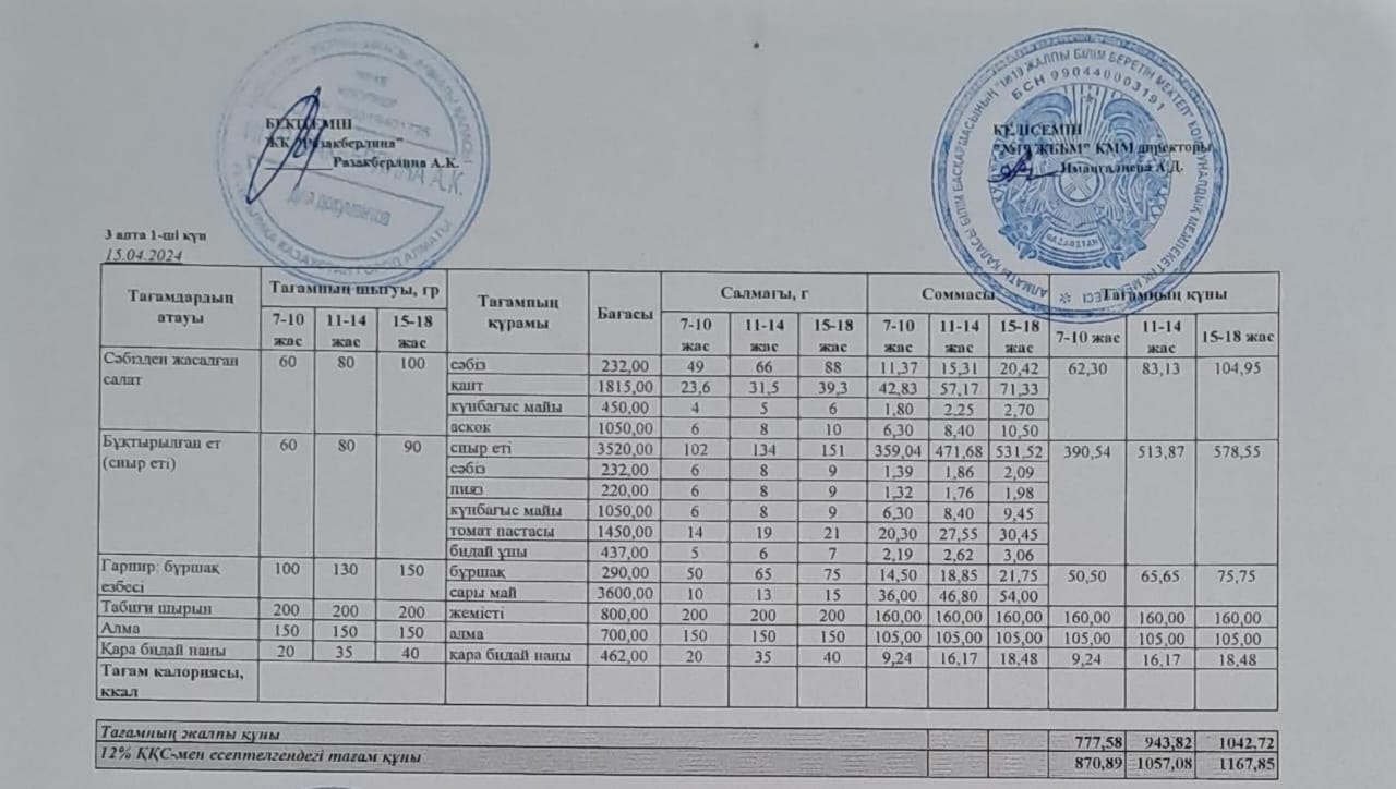 Күнделікті тегін тамақтану мәзірі (15.04.2024)