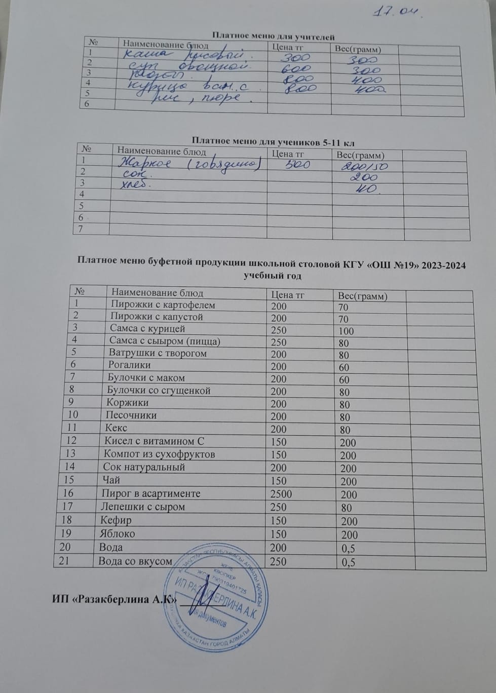 Күнделікті ақылы тамақтану мәзірі (17.04.2024)