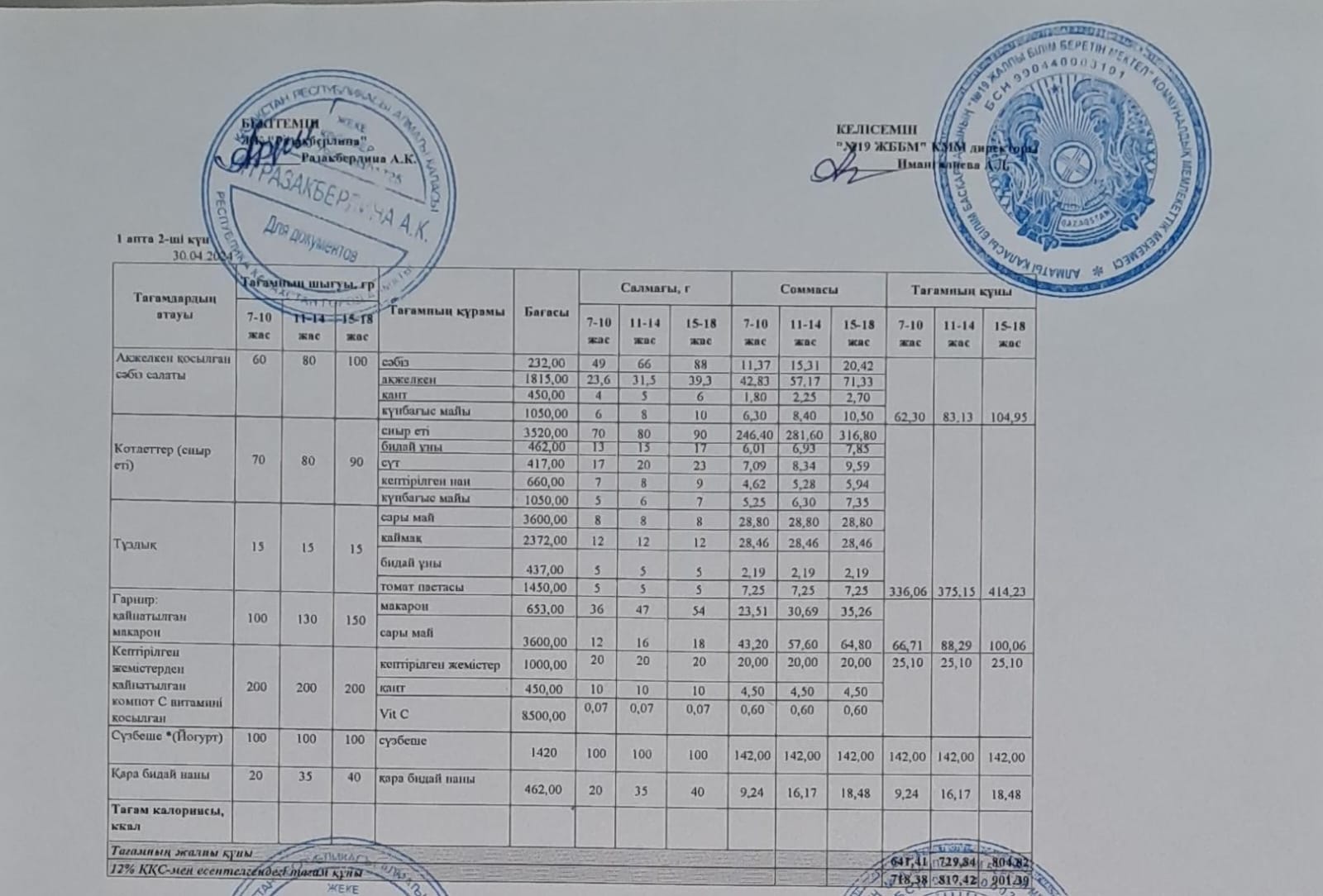 Күнделікті тегін тамақтану мәзірі (30.04.2024)