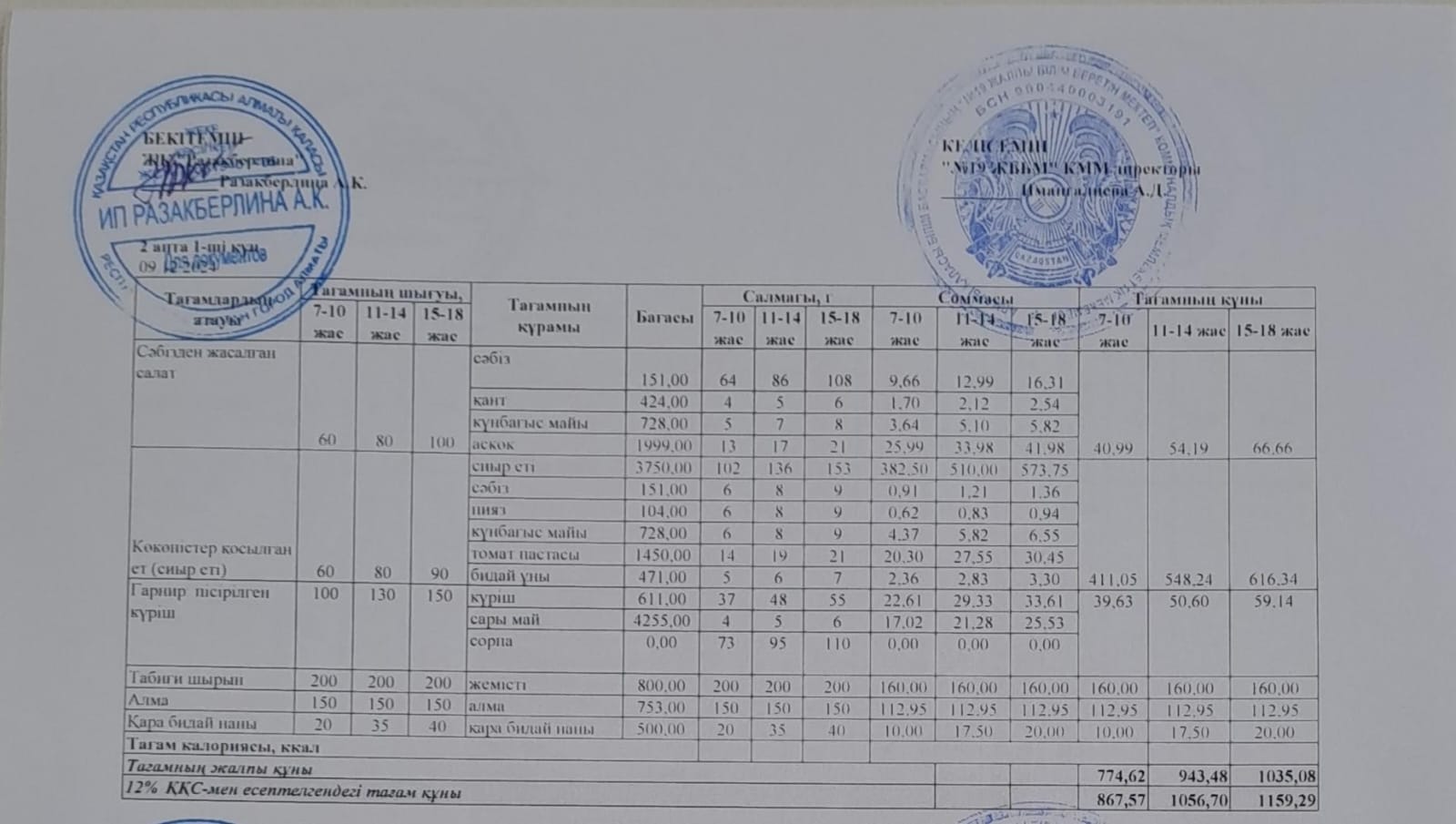 Күнделікті тегін тамақтану мәзірі (09.12.2024)