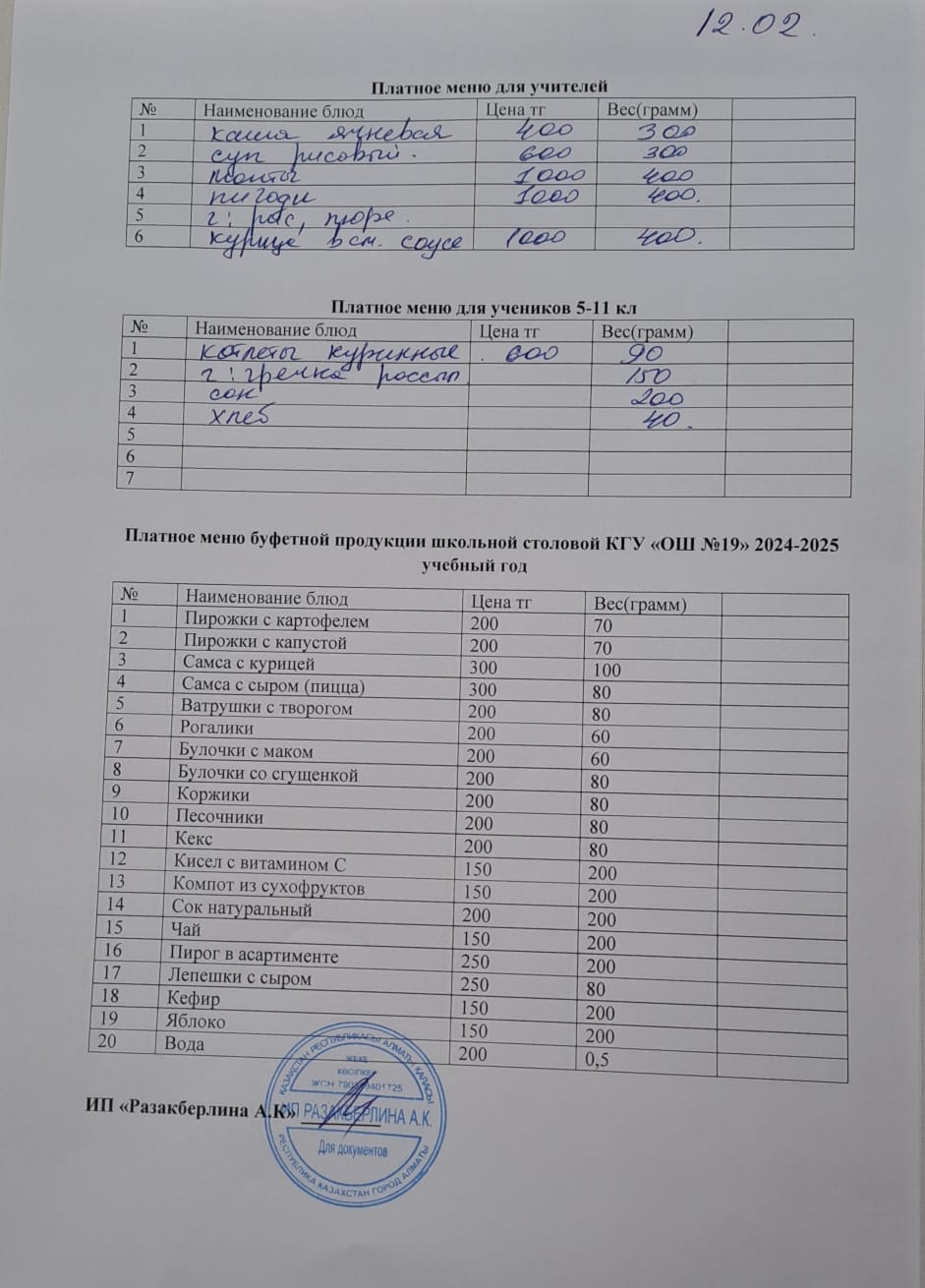 » Күнделікті ақылы тамақтану мәзірі (12.02.2025)