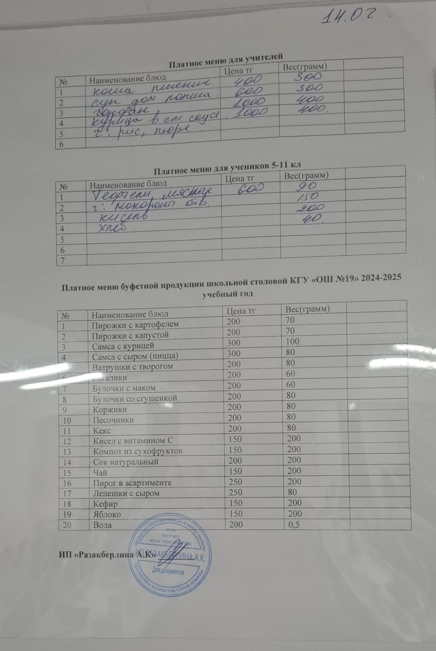 » Күнделікті ақылы тамақтану мәзірі (14.02.2025)