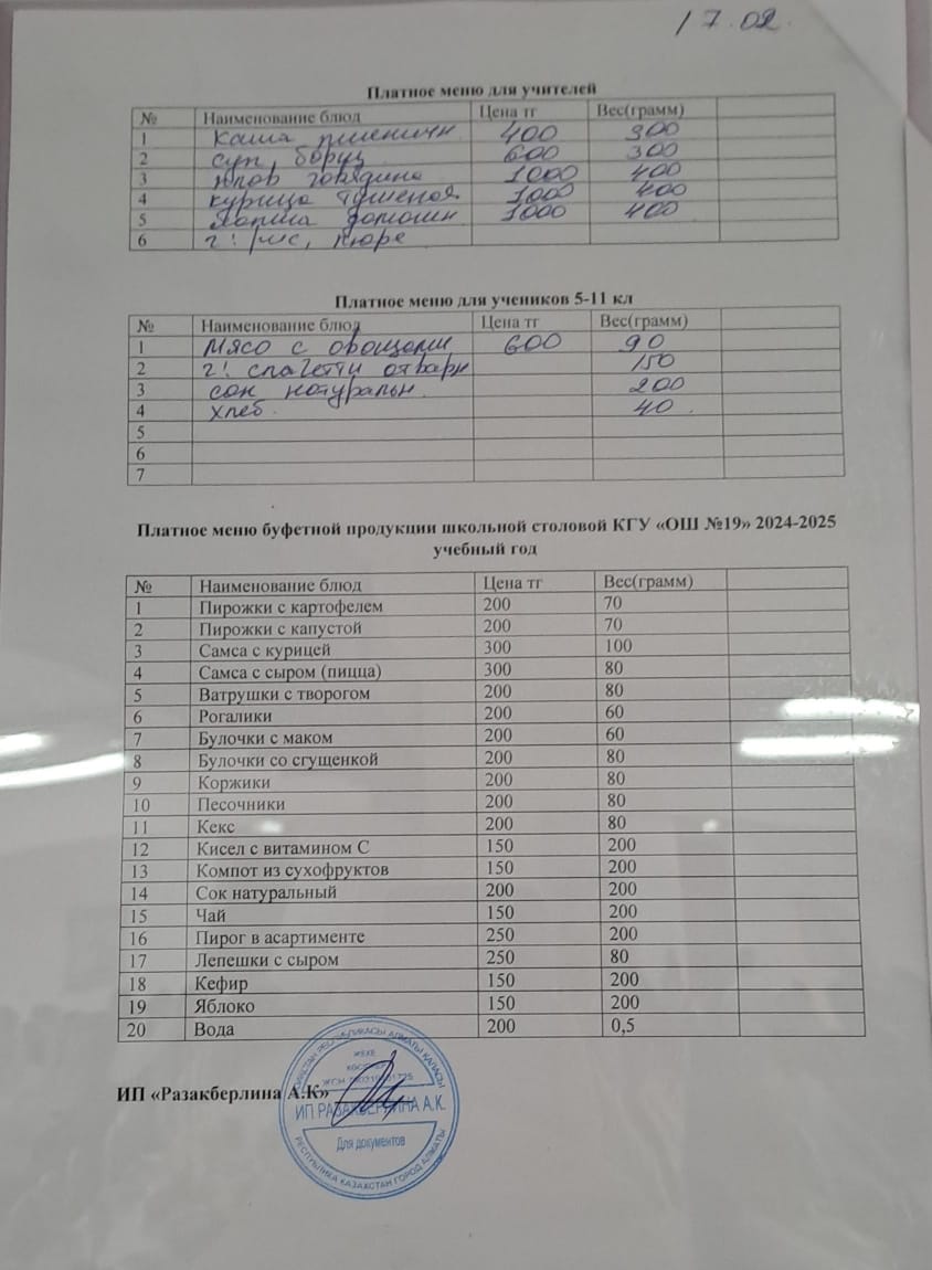 » Күнделікті ақылы тамақтану мәзірі (17.02.2025)