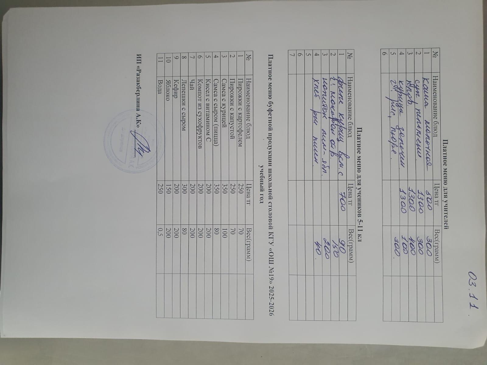 Күнделікті ақылы тамақтану мәзірі (03.11.2025)
