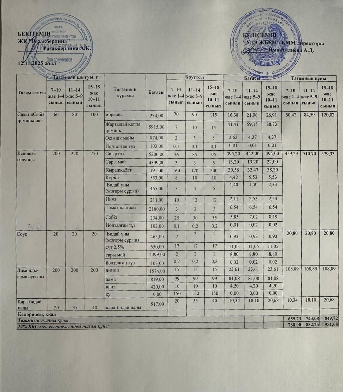 Күнделікті тегін тамақтану мәзірі (12.11.2025)