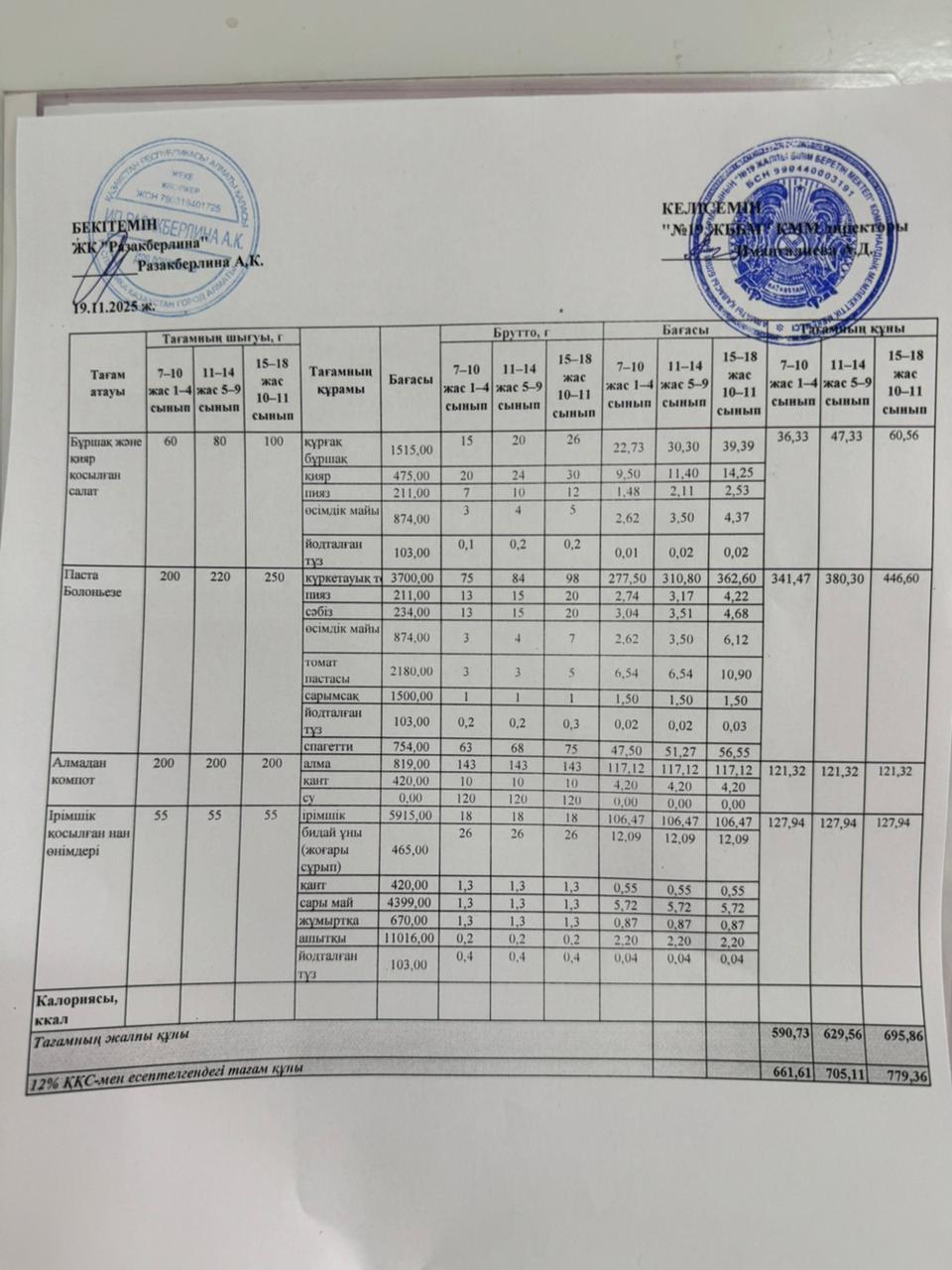 Күнделікті тегін тамақтану мәзірі (19.11.2025)