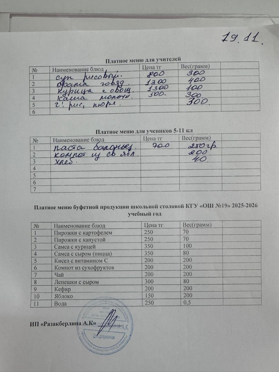 Күнделікті ақылы тамақтану мәзірі (19.11.2025)