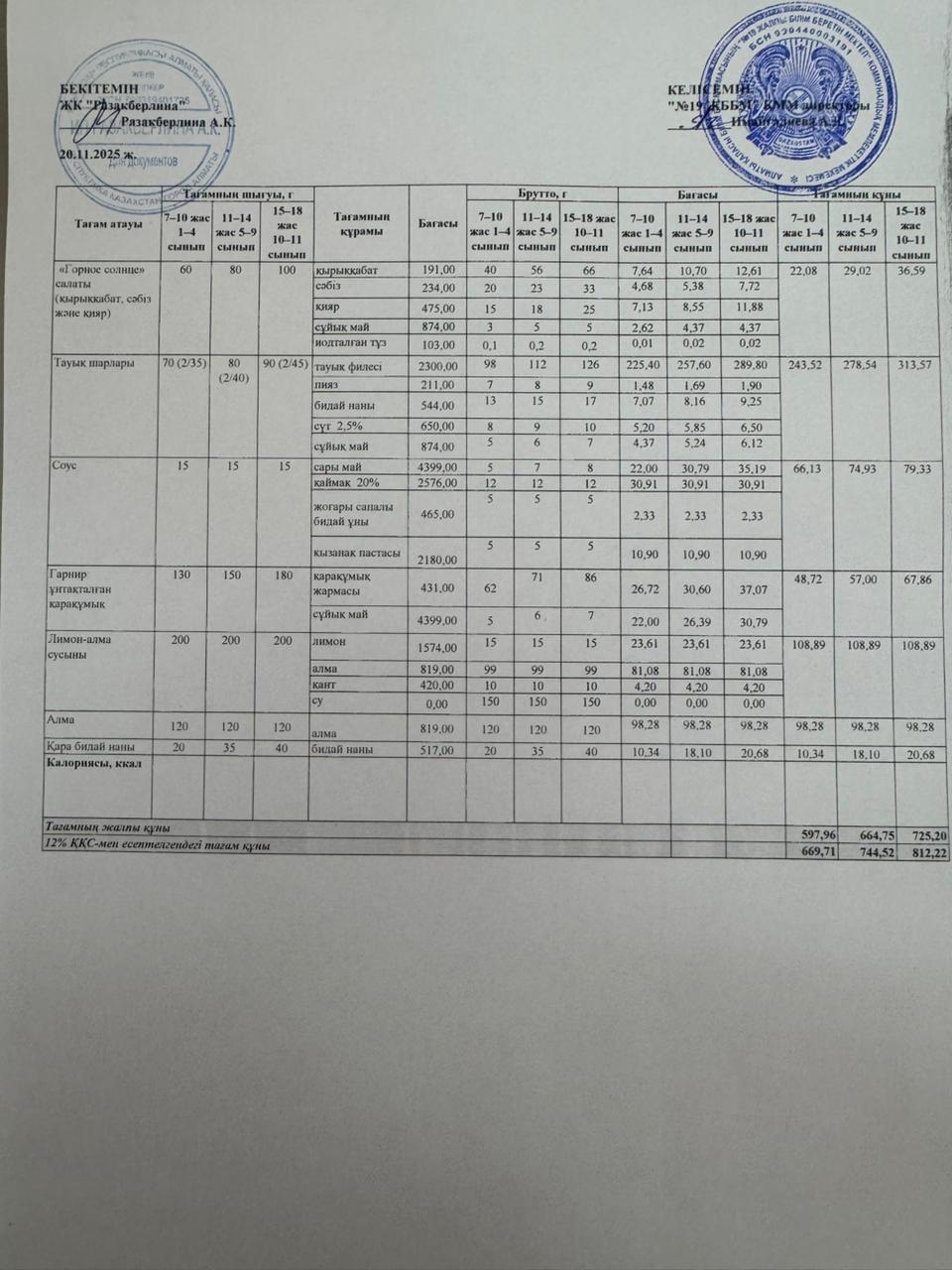 Күнделікті тегін тамақтану мәзірі (19.11.2025)