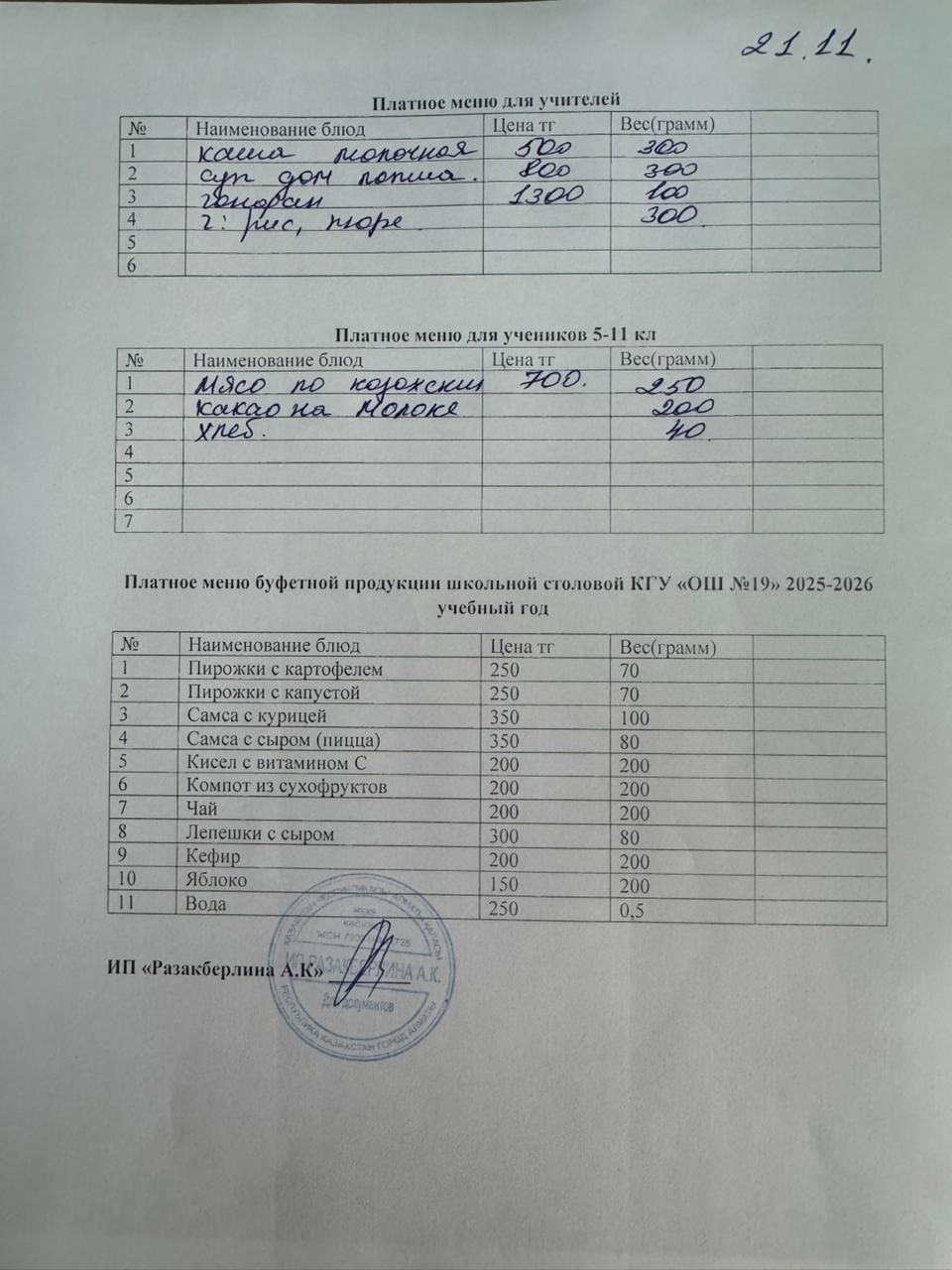 Күнделікті ақылы тамақтану мәзірі (19.11.2025)