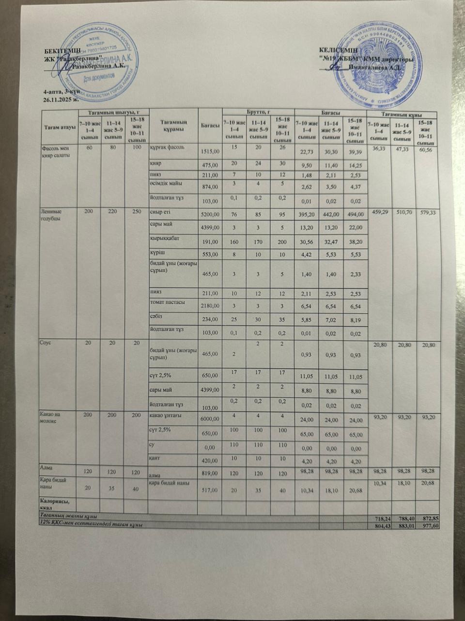 Күнделікті тегін тамақтану мәзірі (26.11.2025)