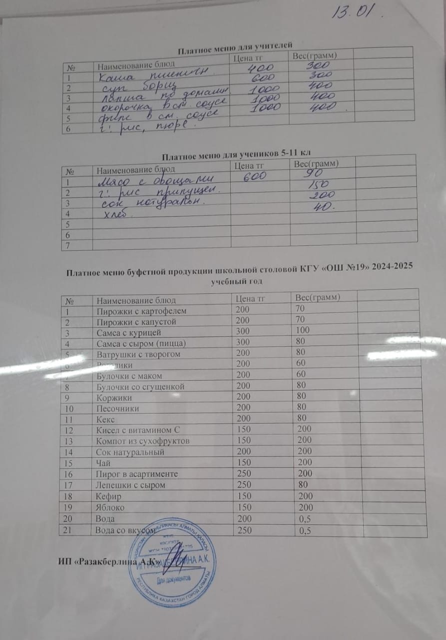 » Күнделікті ақылы тамақтану мәзірі (13.01.2025)