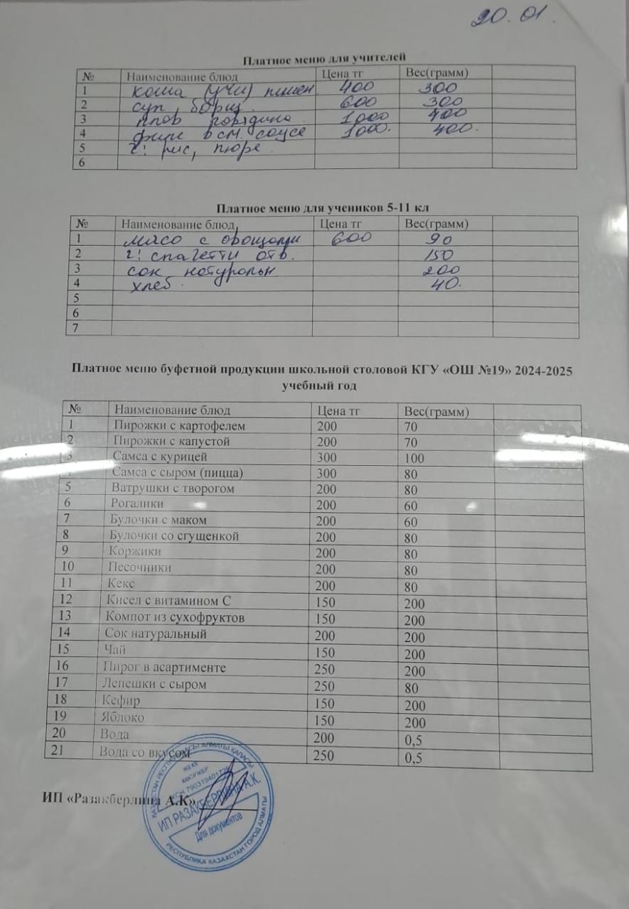 » Күнделікті ақылы тамақтану мәзірі (20.01.2025)