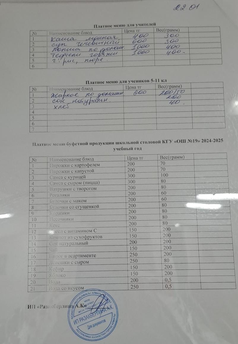 » Күнделікті ақылы тамақтану мәзірі (22.01.2025)