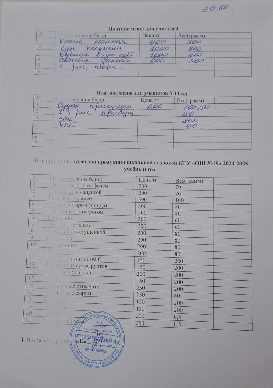 » Күнделікті ақылы тамақтану мәзірі (30.01.2025)