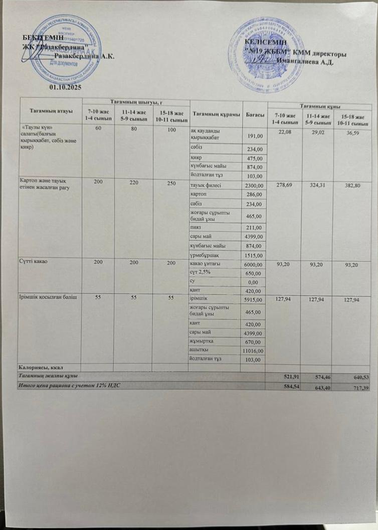 Күнделікті тегін тамақтану мәзірі (01.10.2025)