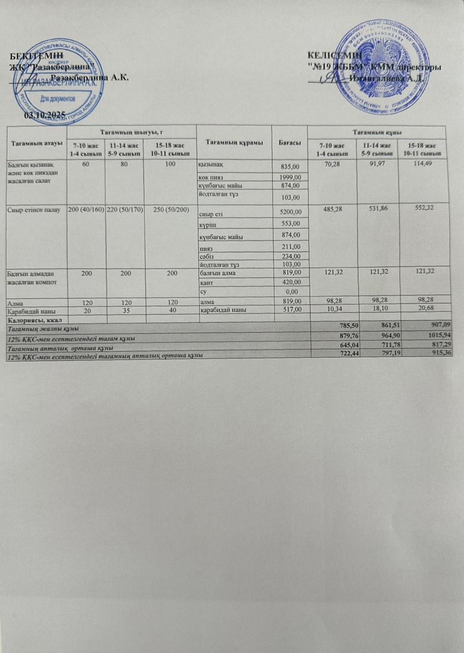 Күнделікті тегін тамақтану мәзірі (03.10.2025)