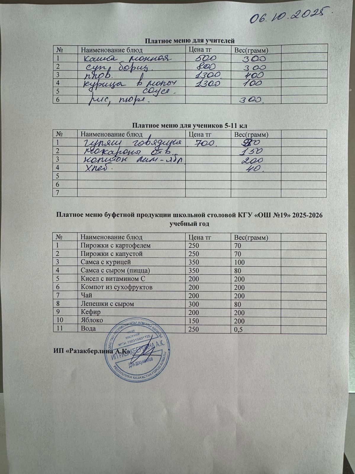 » Күнделікті ақылы тамақтану мәзірі (06.10.2025)