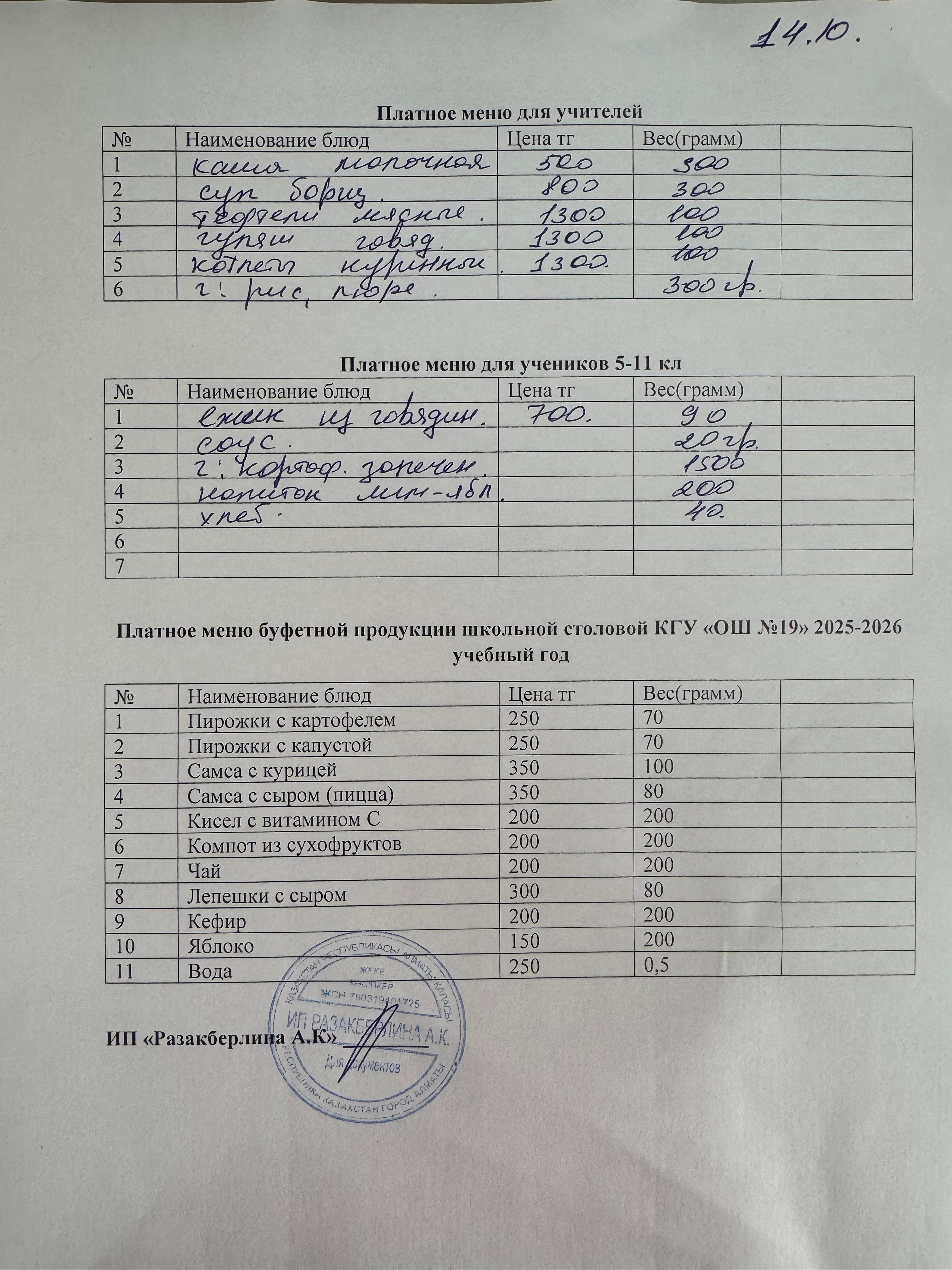 » Күнделікті ақылы тамақтану мәзірі (14.10.2025)