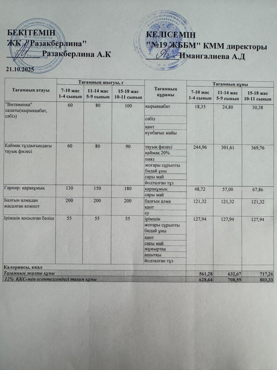 Күнделікті тегін тамақтану мәзірі (21.10.2025)